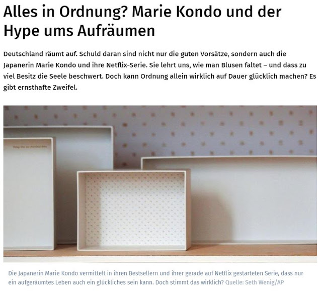 Das aktuell angesagteste, wahnhafte Konzept kommt von Marie Kondo, - wie ich jetzt sogar in unserer Tageszeitung lesen durfte 😨 - einer 34-Jährigen Beraterin aus Fernost. Immer, wenn ein Trend oder ein Skandal oder ganz allgemein ein Themengebiet in unserem Käseblatt Provinz-Magazin auftaucht ist das für mich das Zeichen, dass es sich dabei um kein kleines Nischenphänomen oder Randthema mehr handelt, sondern jetzt auch wirklich in der letzten Ecke der Gesellschaft angekommen ist. Wenn also sogar wir hier im hinterletzten Dorf über die Japanerin, die "in ihrer Netflix-Serie lehrt, wie man Blusen faltet und dass zu viel Besitz die Seele beschwert" informiert werden, dann ist es Zeit, dass auch ich mich damit mal beschäftige.. ich komme nicht mehr drumherum.